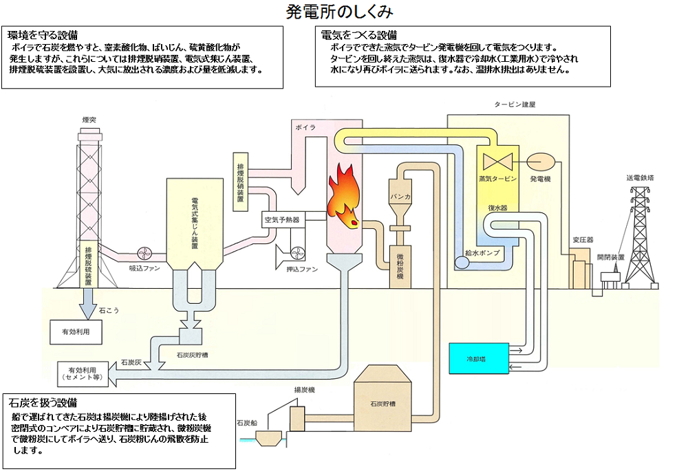 また、発電に利用した蒸気の復水方法は、海水冷却方式ではなく冷却塔方式を採用し、温排水による海域の温度上昇を回避することにより、環境への影響を低減します。